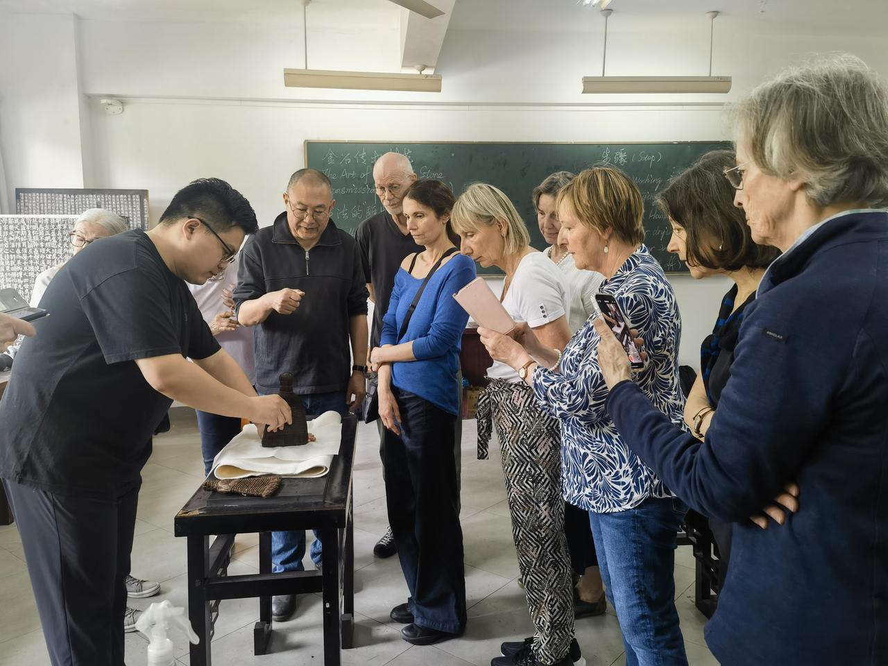 金石传拓技艺课上,王飞(左二)向瑞士学院介绍传拓技艺与书法的紧密关系,记者 孙良摄。