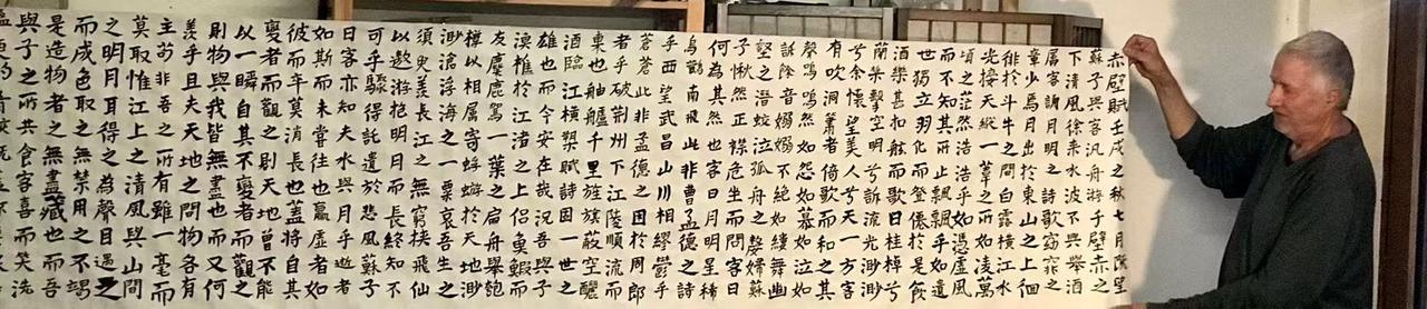 另一名瑞士书法学员Eric Musy(穆晖)是一位建筑师,学习书法近40年,虽年过九秩,仍挥毫不辍。8年前,因中风偏瘫,穆晖一度失去生活自理能力,后来,凭借着顽强的意志,他坚持康复训练,特别是每天练习书法,最终获得康复。尤其感人的是,为了帮助他人,他经常到康复中心传授书法,通过言传身教服务其他患者。在穆晖那里,书法除了审美,还可以是康复、强身,呈现出一种勃郁的生命状态。