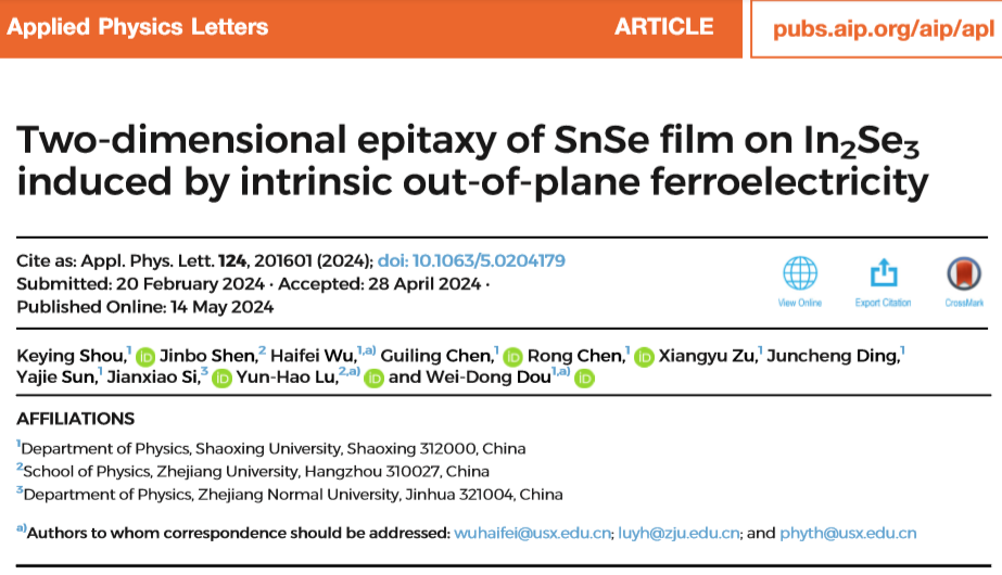 近日,我校窦卫东教授和吴海飞副教授课题组在Nature Index(NI)收录的自然科学类期刊《Applied Physics Letters》上发表一篇高水平论文,提出了利用In2Se3铁电特性调控SnSe原子的扩散动力学行为,制备出高质量二维SnSe薄膜的方法。此方法为高质量二维范德华异质结构的生长和性能调控提供了新的思路。
