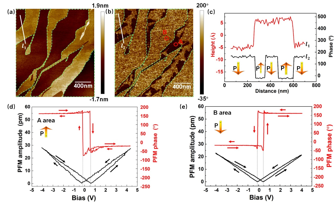 压电原子力显微镜(PFM)测得的α-随机分布的极化向上和极化向下电畴