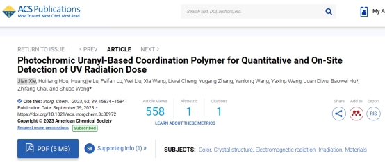 日前,我校谢健博士在Nature index期刊Inorganic Chemistry上发表了题为“Photochromic Uranyl-Based Coordination Polymer for Quantitative and On-Site Detection of UV Radiation Dose”的研究论文,胡保卫教授为共同通讯作者。该团队基于光敏有机配体设计合成了一例具有高耐辐照性和化学稳定性的光致变色配位聚合物(SXU-1)。研究发现,在紫外光照射下(365 nm,2 mW),该材料具有极快的变色效应,其颜色在一秒内由浅黄色转变为橘色,随着照射时间的延长,颜色逐渐转变为砖红色。作者利用UV-vis吸收光谱、EPR光谱以及单晶衍射数据深入研究了材料的变色机理。基于该材料优异的光致变色性质,作者将SXU-1引入至商用光电设备制作了一种新颖的紫外光剂量计,其具备便携、定量以及可在线监测等优势。